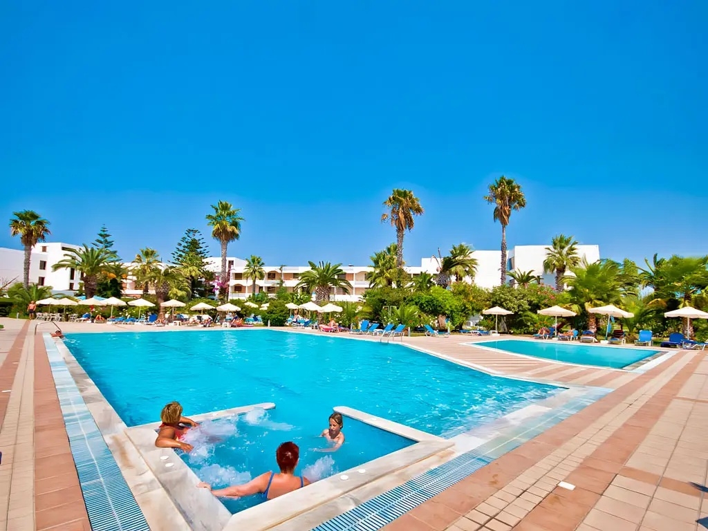 - all inclusive, velmi oblíbený hotel v klidné části letoviska Tigaki, obklopený udržovanou zahradou, cca 300 m od centra letoviska s bary, restauracemi a obchůdky